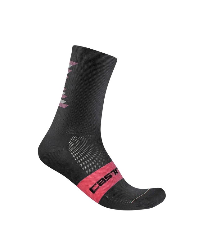 Čarape CASTELLI Giro d'Italia 15 imaju natpis CASTELLI okružen ružičastom trakom preko stopala i grafiku Trofeo Senza Fine na leđima u čast La Corsa Rosa, koja seže do razine potkoljenice. Izrađene su od Q-Skin pređe koja je dizajnirana da se može prati i sadrži antimikrobne ione srebra. Oni se aktiviraju kada se znojite, neutraliziraju bakterije i rješavaju neugodne mirise kako bi vaša stopala ostala svježa. Tkanina je također lagano kompresivna, pa potiče protok krvi i zacjeljivanje tijekom vožnje biciklom.