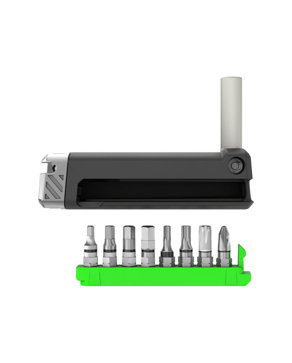 Naš ergonomski Greenslide alat sa sklopivim držačem bitova. Kompletan set od 11 dijelova uklj. zakovica za lanac, držač brze spojnice i TORX i HEX bitovi. Prilagodite svoj komplet do savršenstva kroz pojedinačne komade.