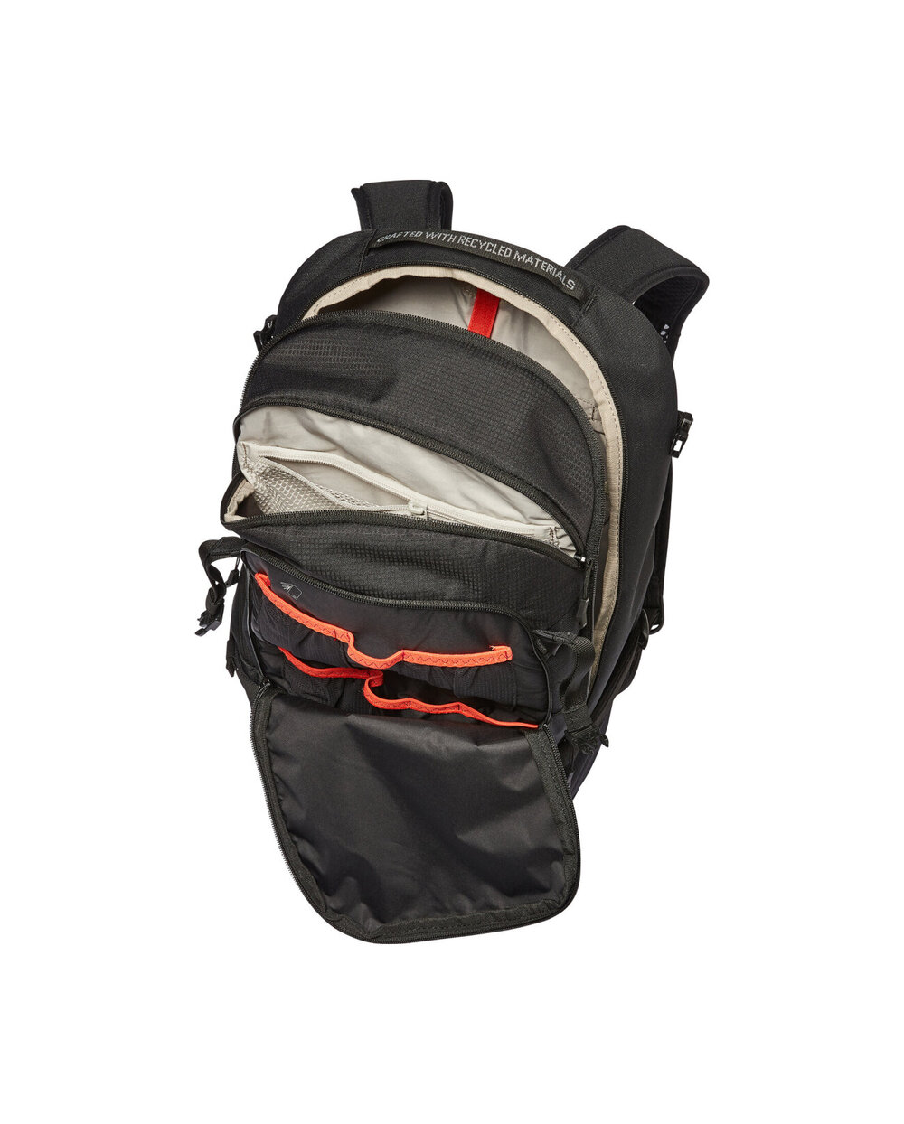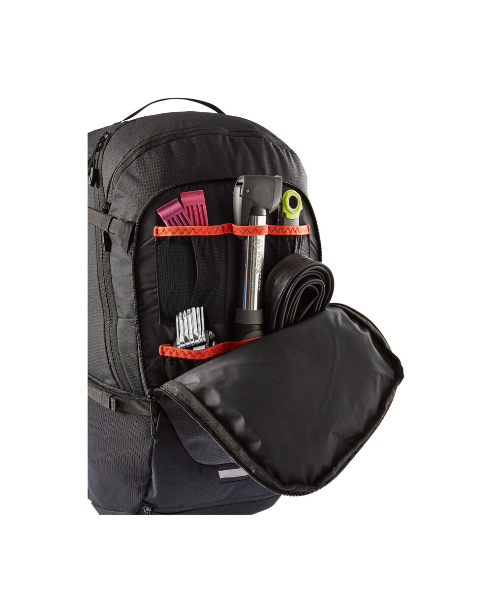 - Ispred glavnog odjeljka nalazi se unutarnji džep s zip -om, odjeljak za alat, držač kaciga, desno krilo lumbalnog pojasa, džepovi za rastezanje očiju, odvojeni odjeljak za vlaženje, kompresijske remene na bočnim stranama, remen za sunčanu naočalu, kabanica u zasebnom donjem odjeljku i refleksno