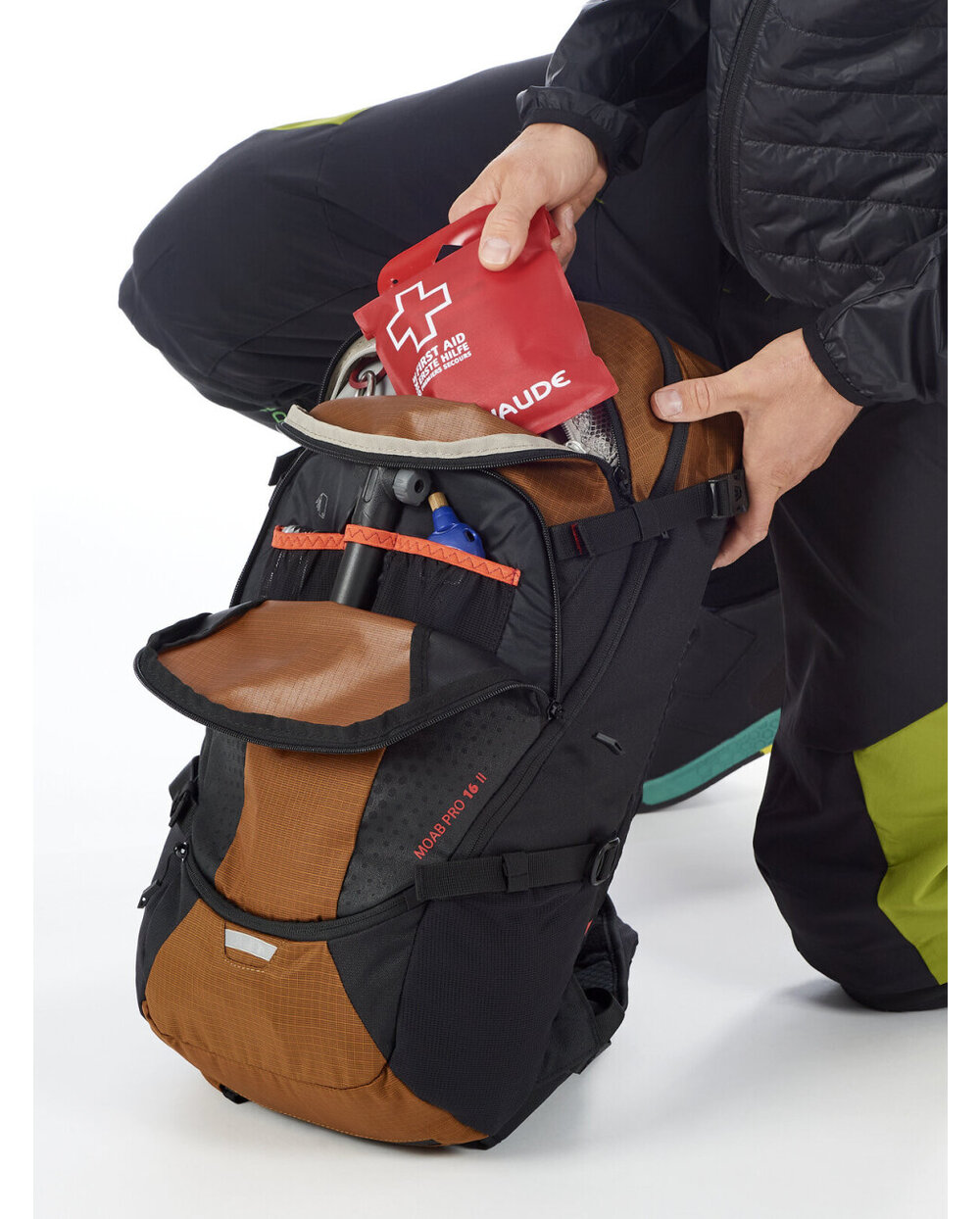 - Veliki prednji odjeljak ima niz alata za aranžman, džep za unutarnju mrežicu, ostali džepovi od mrežice nalaze se na bočnim stranama i na desnom lumbalnom krilu, uključuje uklonjivi kabanica i fleksibilni držač kaciga, koji se također može koristiti za transport integralne kacige