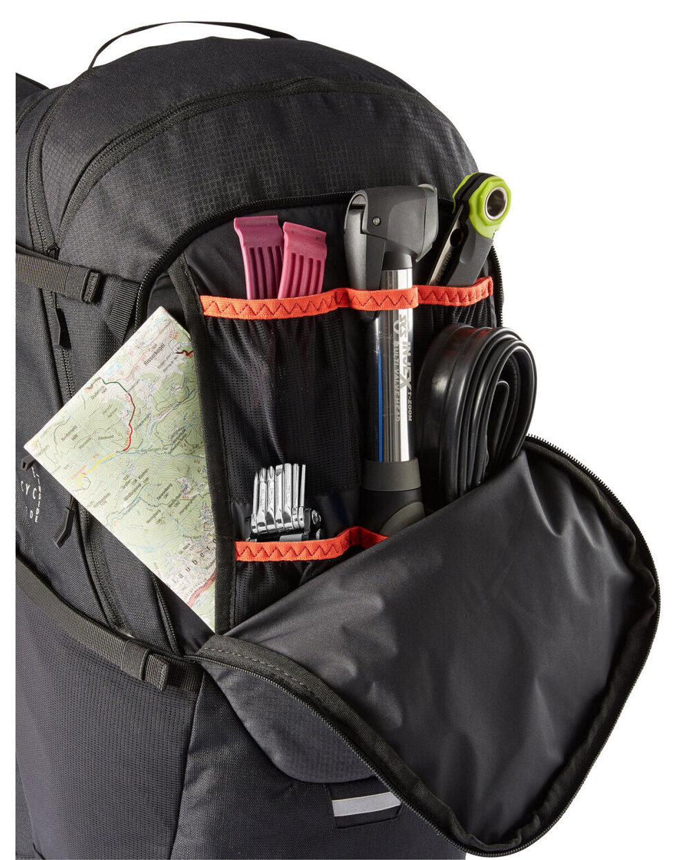 - Ergoshape - ergonomske naramenice za rame, optimalna sloboda kretanja zahvaljujući njihovoj modificiranoj širini - Venti Active Bike - Sustav ovjesa pruža stabilnost i udobnost, idealan prijenos opterećenja i stabilnost pakiranja zahvaljujući ergonomskoj stražnjoj ploči, izvrsnoj ventilaciji za leđa zahvaljujući zračnim kanalima u punjenju - Udoban lumbalni pojas povlači težište ruksaka prema leđima - Ruksak je podijeljen u tri odjeljka. Veliki glavni odjeljak može se podijeliti za bolju organizaciju odjeće i hrane i nudi odvojeni pristup odozgo ili dna, ispred njega je još jedan odjeljak za naočale ili novčanik, odjeljak za alat sprijeda, ispod njega je mjesto za karte ili druge dokumente, također ima skriveni odjeljak s držačem kaciga - džep s patentnim zatvaračem s desne strane lumbalnog pojasa, bočni džepovi za strije, odvojeni odjeljak za hidratantnu vrećicu, kompresijske remene na vrhu, kabanica u zasebnom donjem odjeljku i reflektirajući elementi - Eko završna obrada površine štiti materijal od vode i mrlja