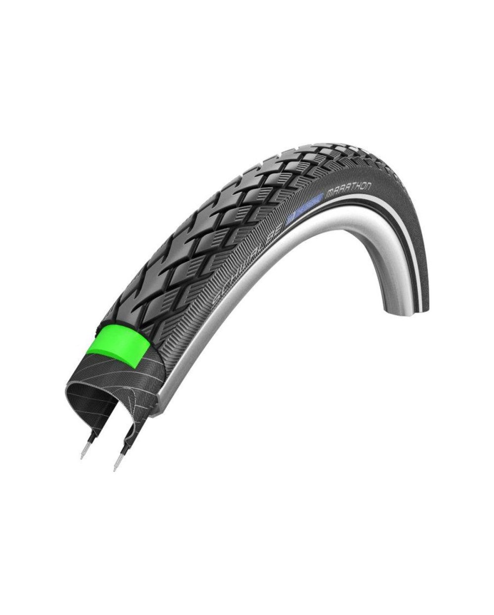 Izvornik: Predak svih prvoklasnih touring guma. Vrlo elastičan sloj GreenGuard debljine 3 mm, jedna trećina izrađena od recikliranih proizvoda od lateksa. Zahvaljujući "Anti-Aging" tretmanu, trajat će puno dulje bez tipičnih oštećenja uzrokovanih vožnjom pod nedovoljnim pritiskom prije nego što se pojave ružne pukotine. Spreman za E-bicikl. Za svoj E-bicikl možete odabrati bilo koji maraton (E-25). Najvažnije dimenzije su odobrene i ispitane za E-bicikle do 50 km/h (E-50). PERFORMANCE LINE: izvrsna kvaliteta za intenzivnu upotrebu, najprodavanije gume. GREENGUARD - razina zaštite 5 - 3 mm fleksibilna, specijalna indijska guma, djelomično izrađena od recikliranog materijala. IZDRŽLJIVOST: Smjesa maratonskih guma za najduži mogući vijek trajanja. RECIKLIRANJE. Stari proizvodi od prirodne gume (kao što su rukavice, zračnice...) usitnjavaju se i koriste u nekoliko proizvodnih koraka kao osnovni materijal u proizvodnji sustava za zaštitu od proboja. E-BIKE READY-50. Specijalne gume prikladne za brze električne bicikle. Najbolje rješenje su gume s ECE-R75 certifikatom koji vrijedi u cijeloj Europi. DINAMO. Urez za dinamo. Kotrljanje ●●●●○○ Prianjanje na cesti ●●●●○○ Prianjanje izvan ceste ●●○○○○ Zaštita ●●●●●○ Vijek trajanja ●●●●●○