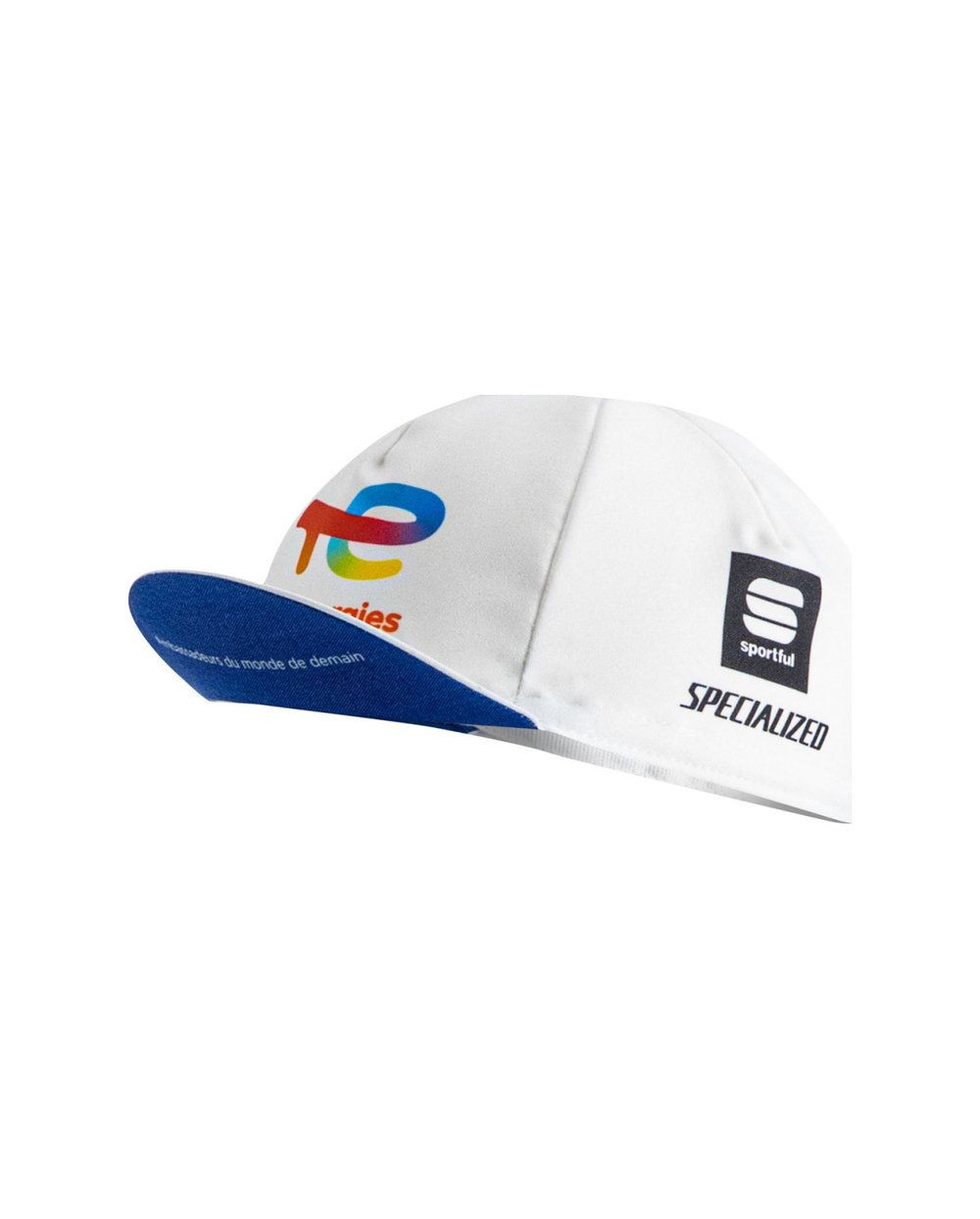 Biciklistička kapa profesionalnog tima TotalEnergies u bijelom dizajnu.