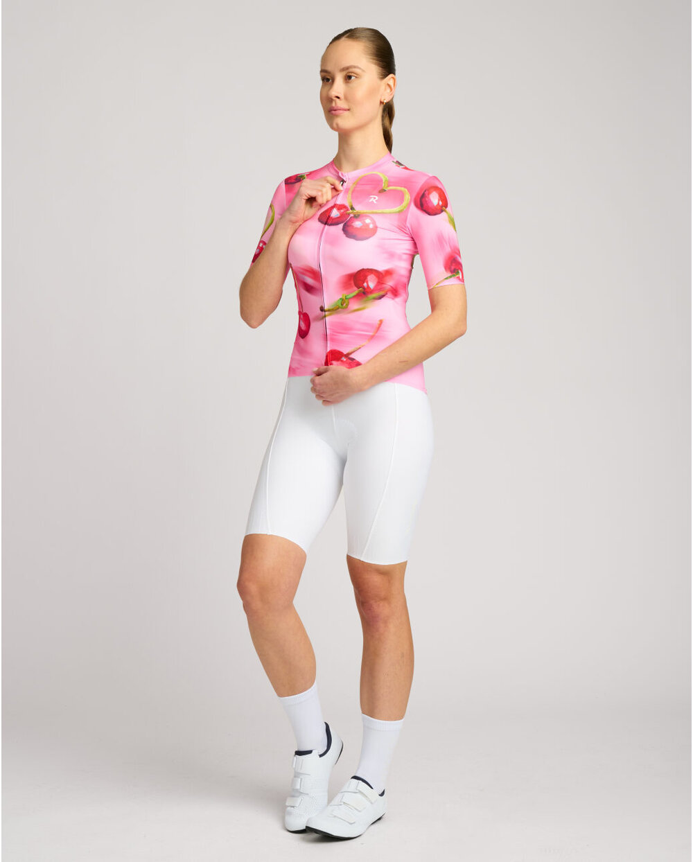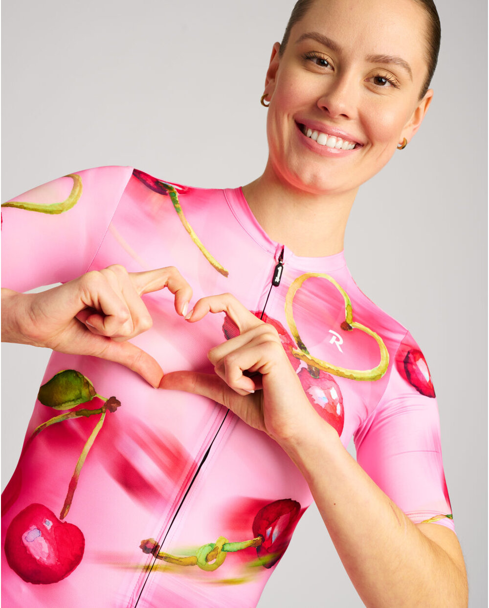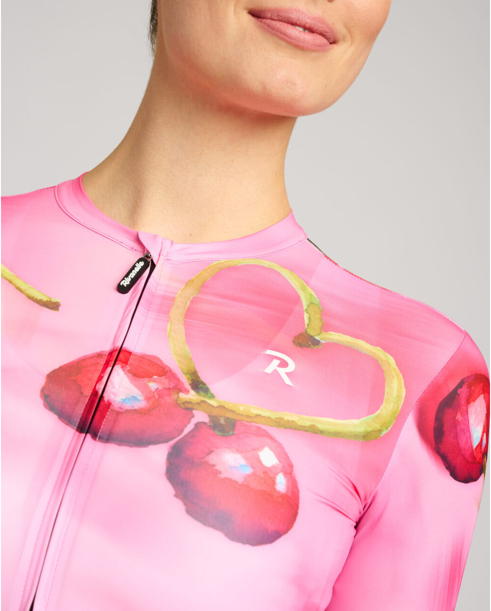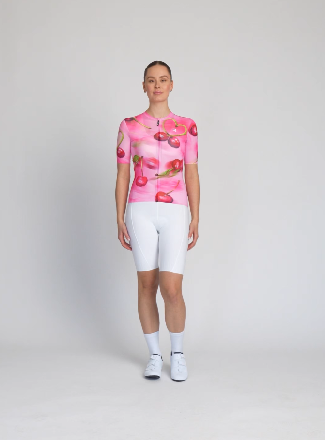 Cherie nije samo dres – to je raspoloženje – slatkoća ljeta i ženstvenost. Ručno ilustrirane trešnje koje se na tkanini miču u pokretu – baš kao vi na cesti. Detalj u obliku srca od peteljke trešnje je diskretan, ali razigran potpis ljubavi prema biciklizmu.