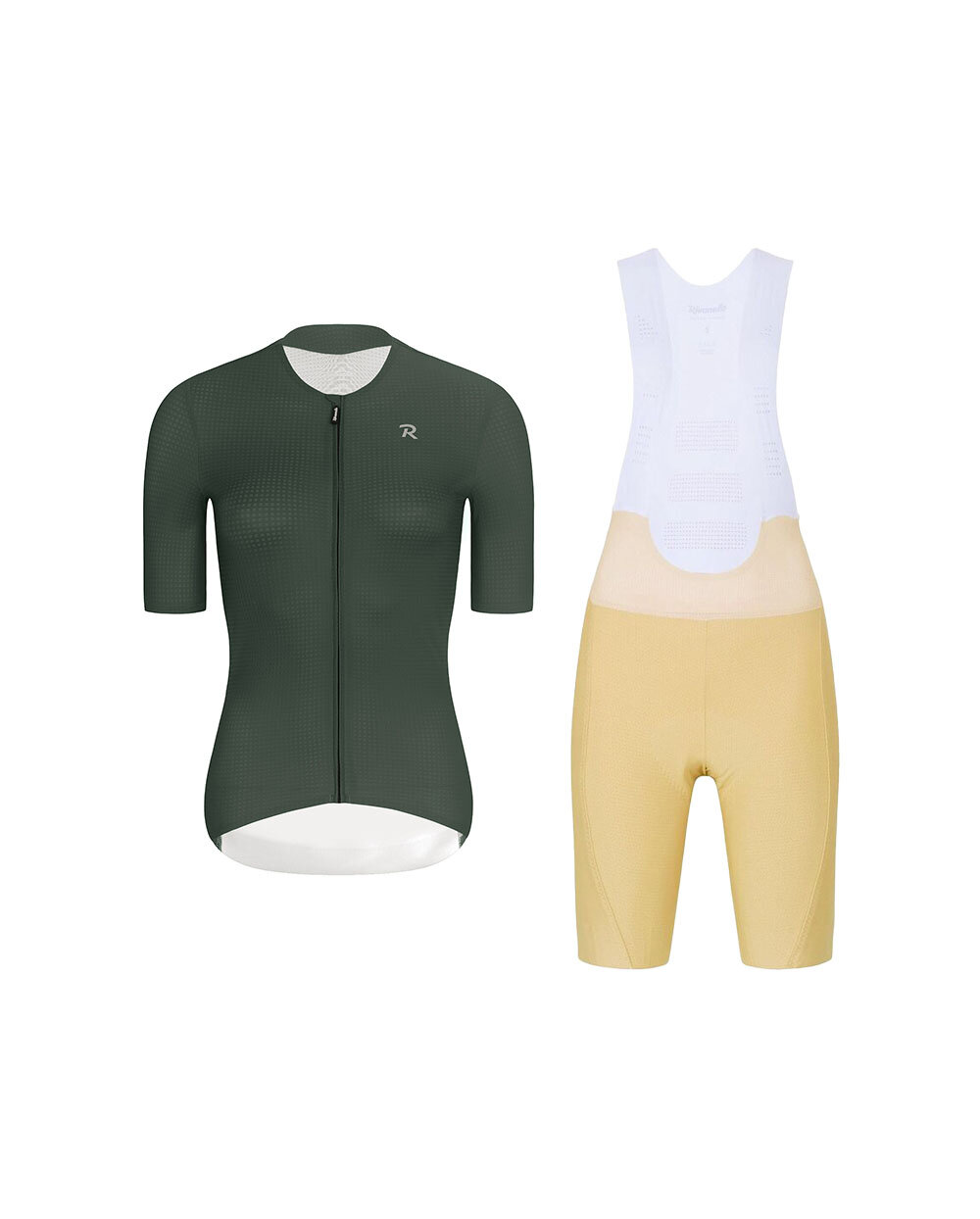 Rivanelle set za bicikliste – ELEVATE zeleni dres + NOVEL PRO bež kratke hlače s naramenicama